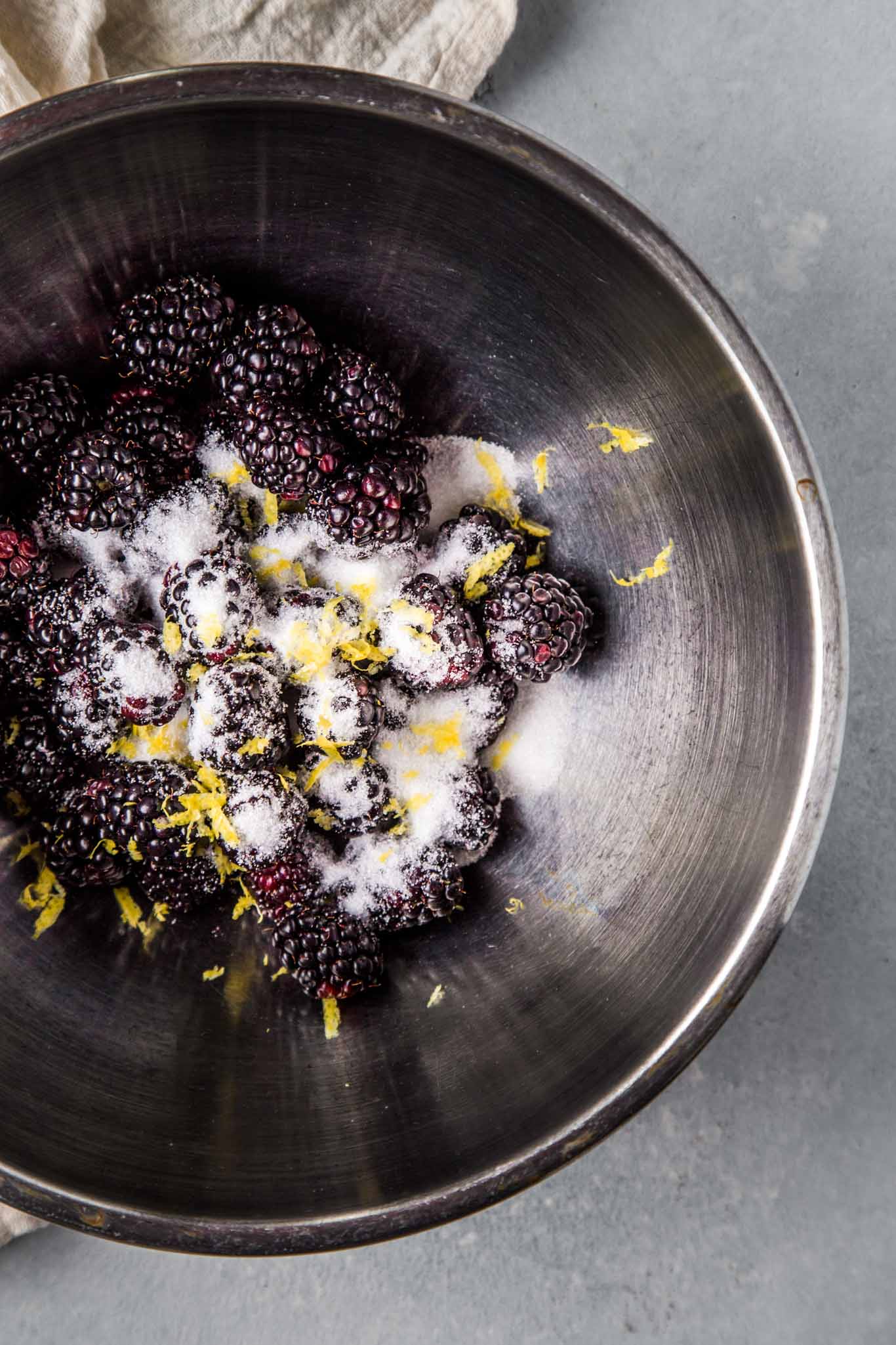 - In a large bowl, gently combine blackberries with sugar, lemon zest, lemon juice, vanilla and 2 tbsp. flour. Add additional flour if the mixture is very wet.