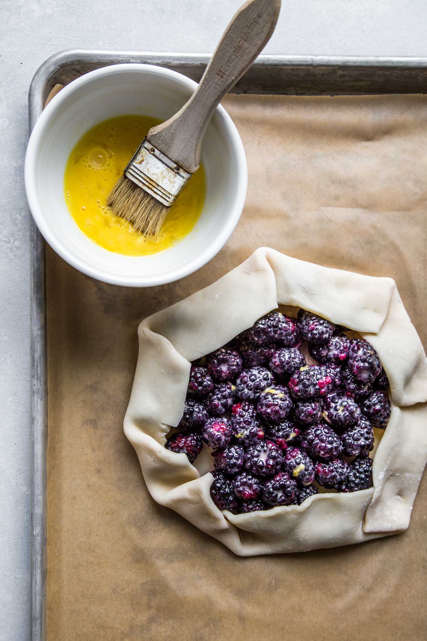 - To give my blackberry galette a bit of a special touch, I brushed the crust with some egg white and sprinkled it with coarse sugar and almonds. As it bakes away, the crust and the almonds will take on the most gorgeous golden color.