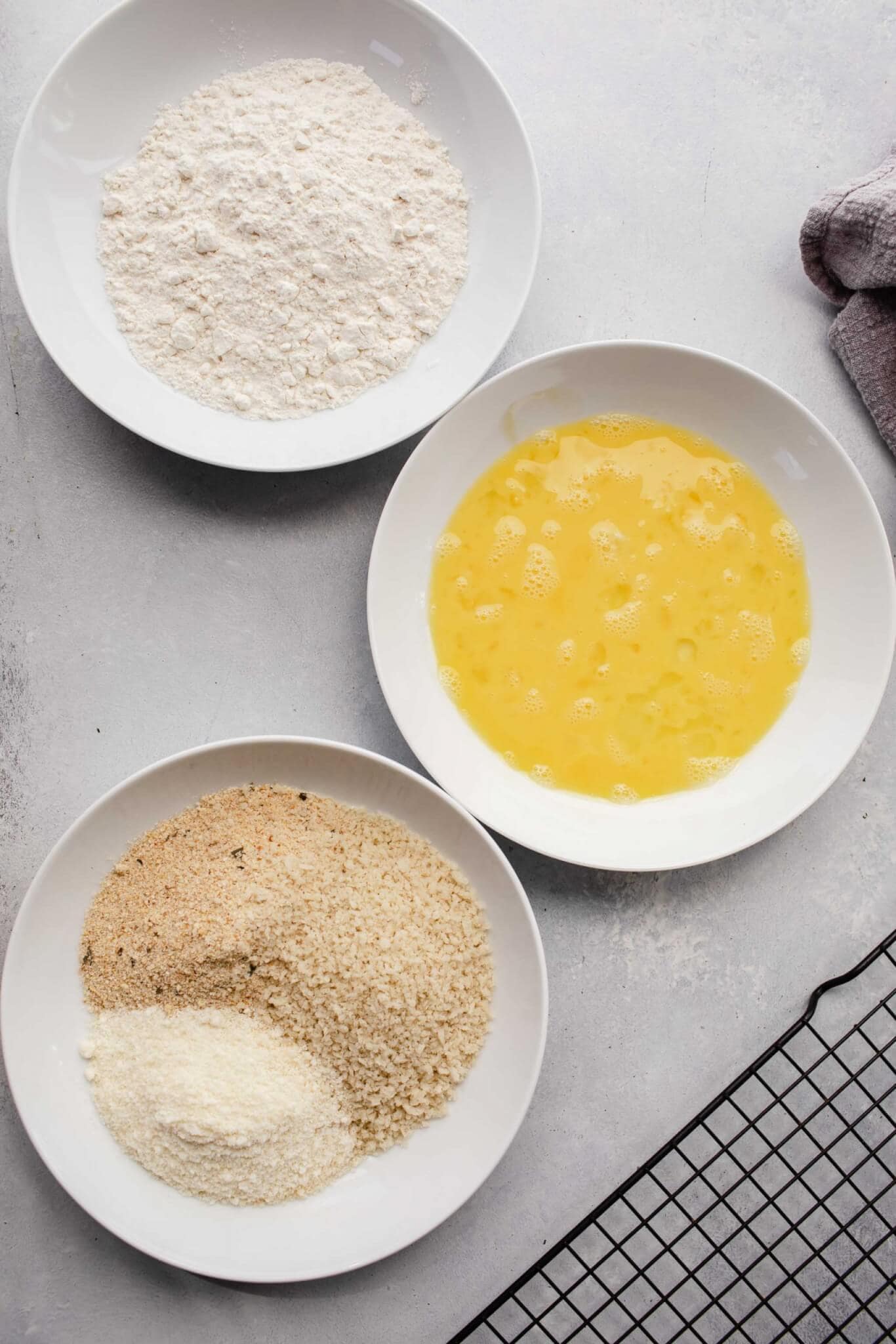 - Grab 3 shallow plates. Add the flour to one. Whisk the eggs in the second one. Mix the panko, breadcrumbs, parmesan, salt, and pepper in the third one.