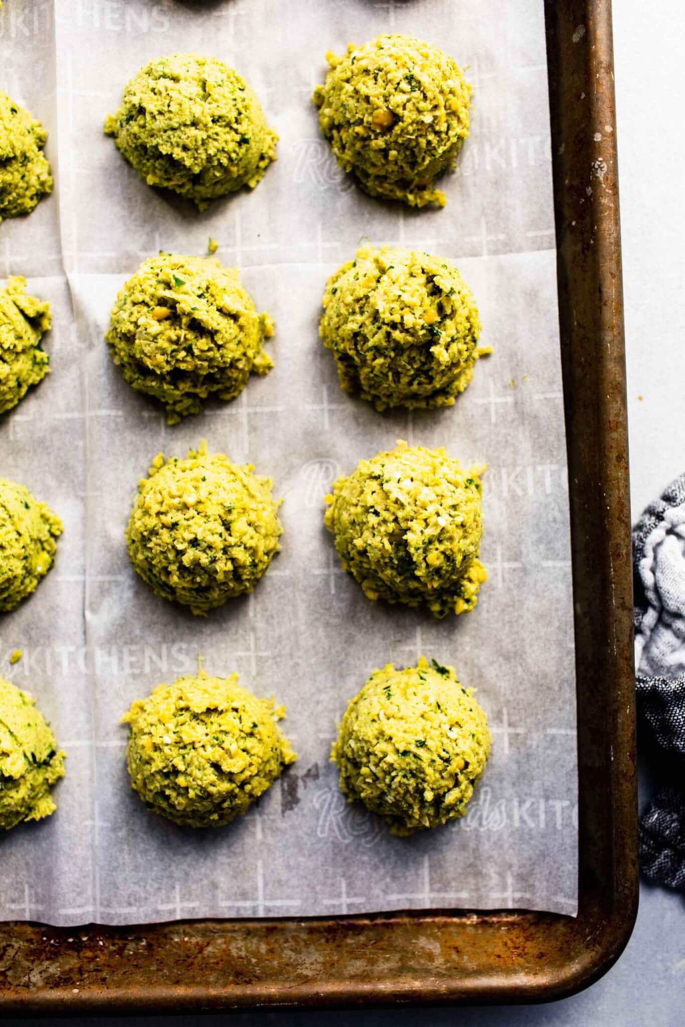 - Using your hands, or a cookie scoop, form falafel into golf ball sized balls.