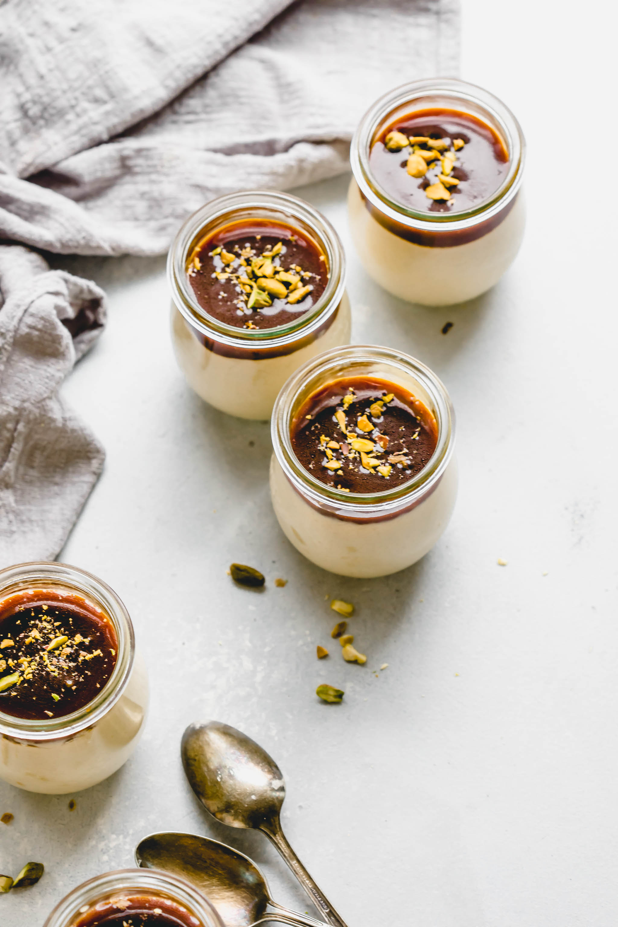 The salted caramel sauce can be made ahead of time as well, even up to a week beforehand. When you’re ready to serve, simply heat up the caramel, drizzle a bit over each budino and top them with a sprinkling of pistachios.