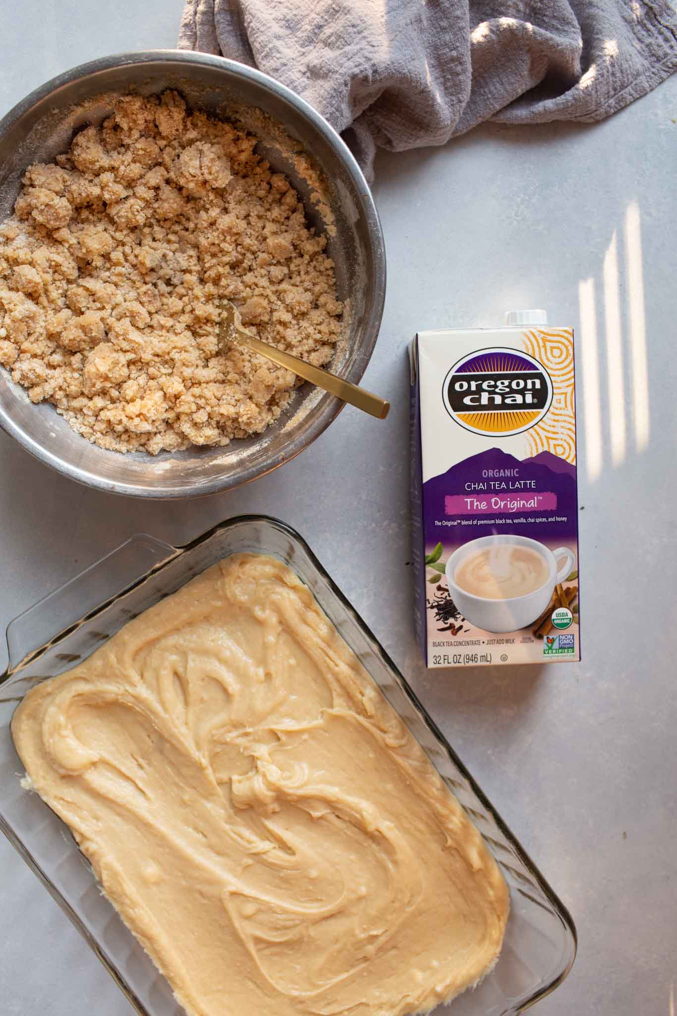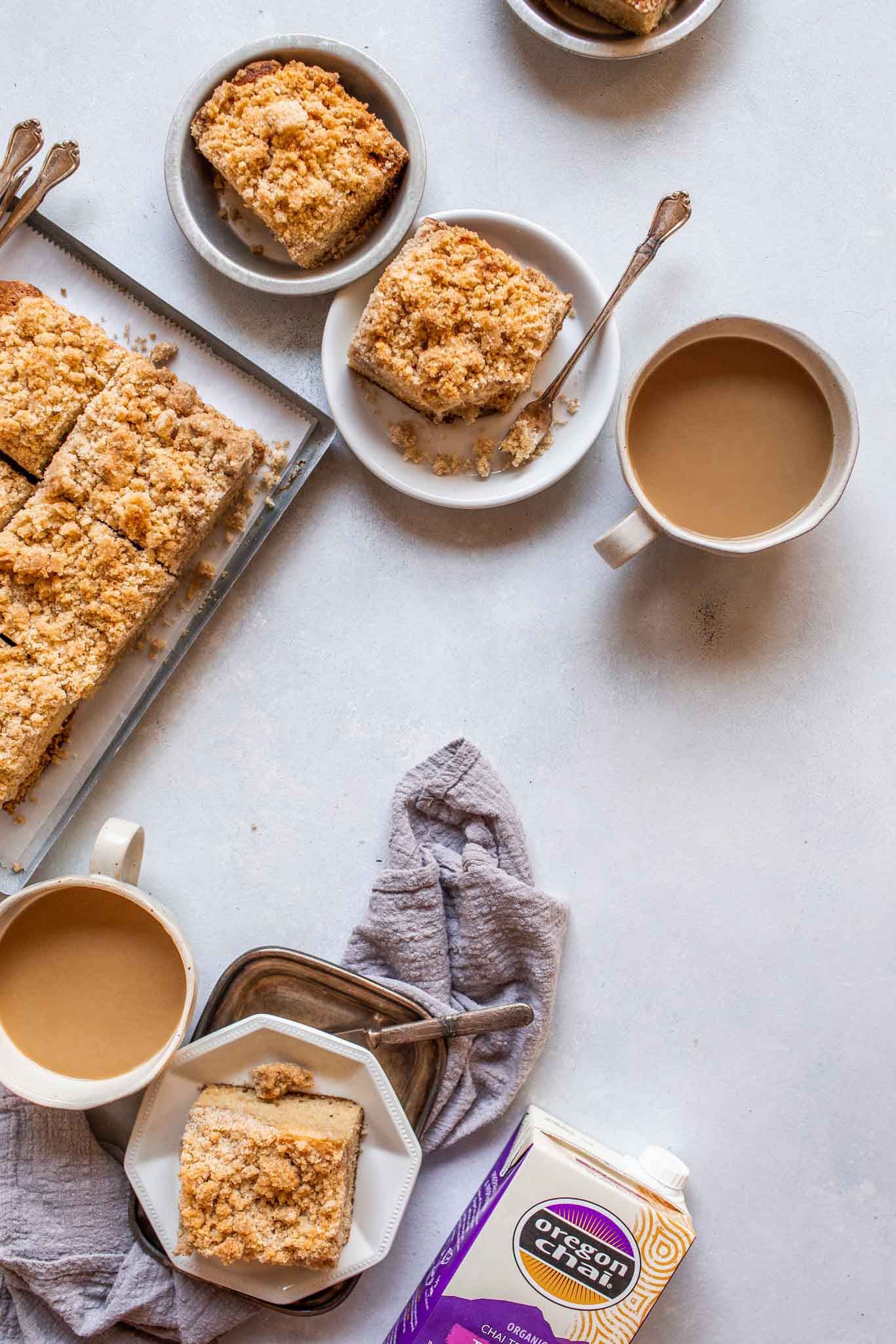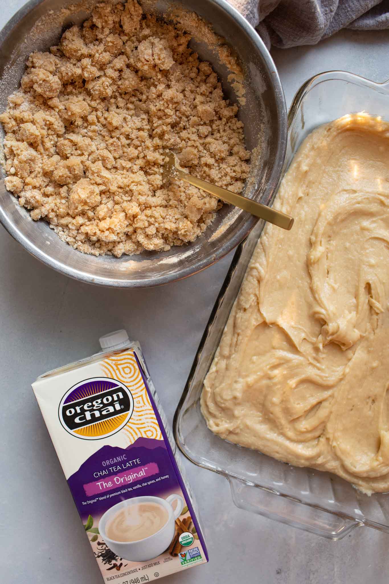 I took my original recipe for Yogurt Crumb Cake and gussied it up a bit – adding chai spices to the crumb topping and that Oregon Chai Tea Latte Concentrate to the cake.