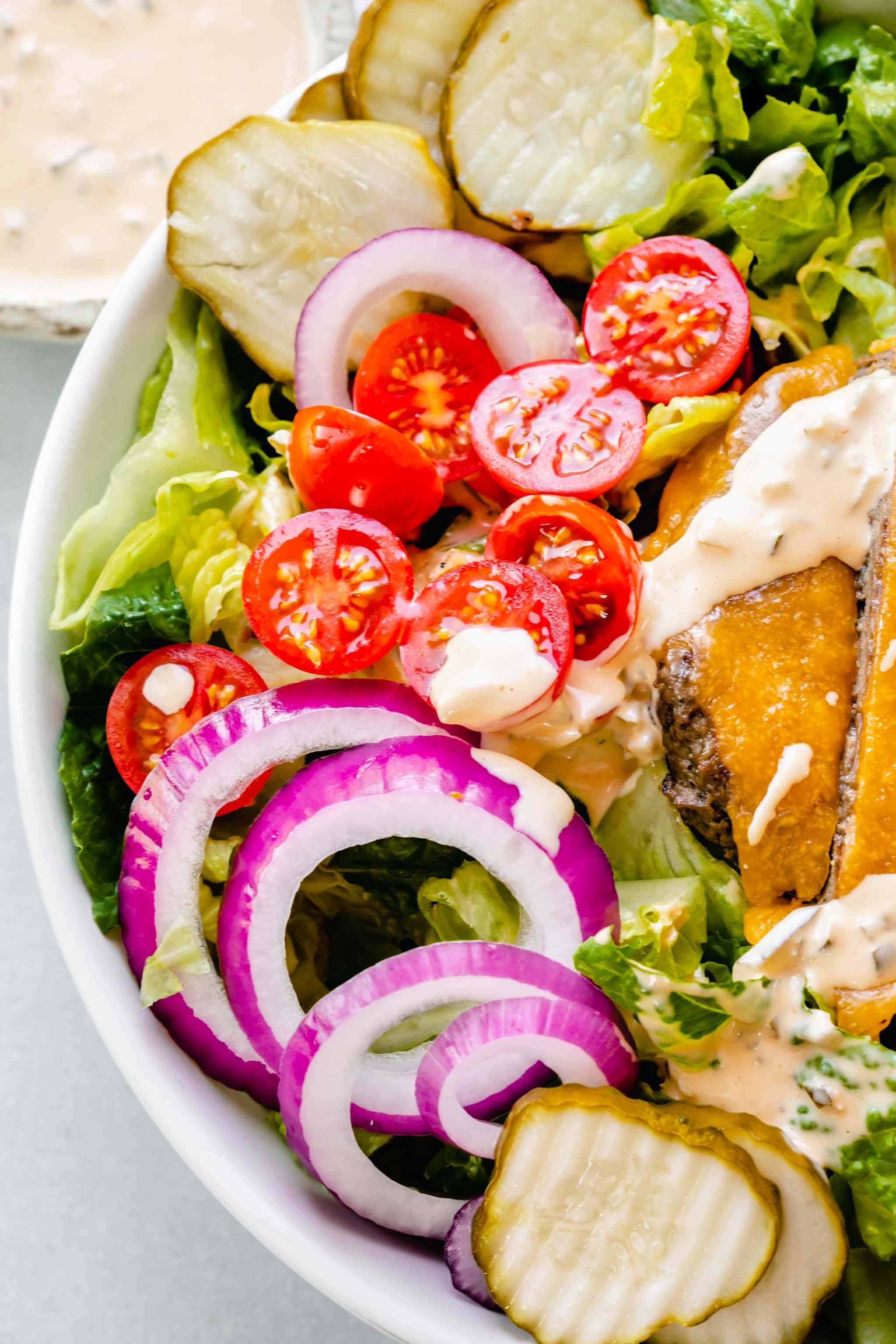 Overhead shot of cheeseburger salad in white bowl next to bowl of special sauce dressing.