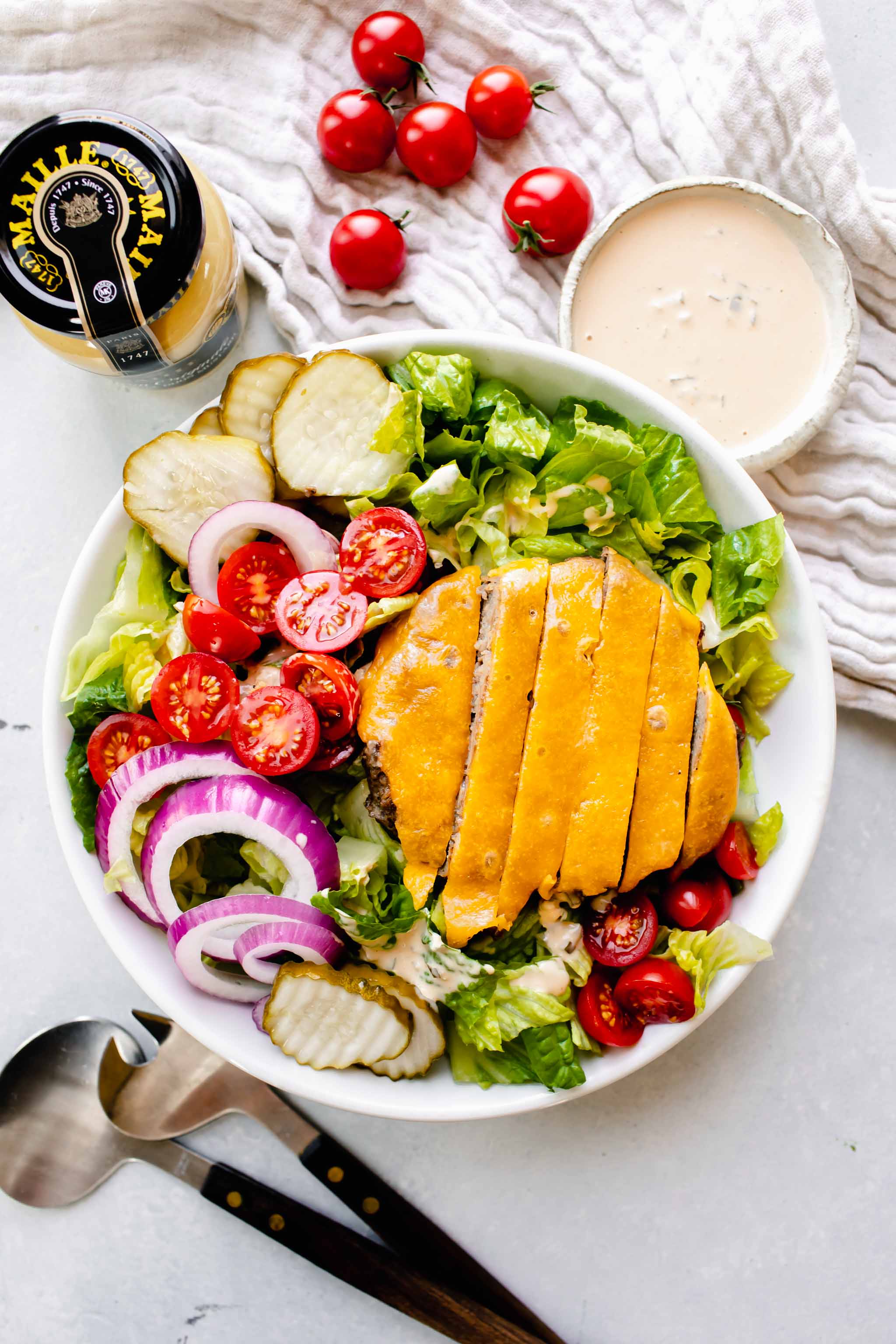 Overhead shot of bowl of cheeseburger salad next to jar of mustard and bowl of special sauce.
