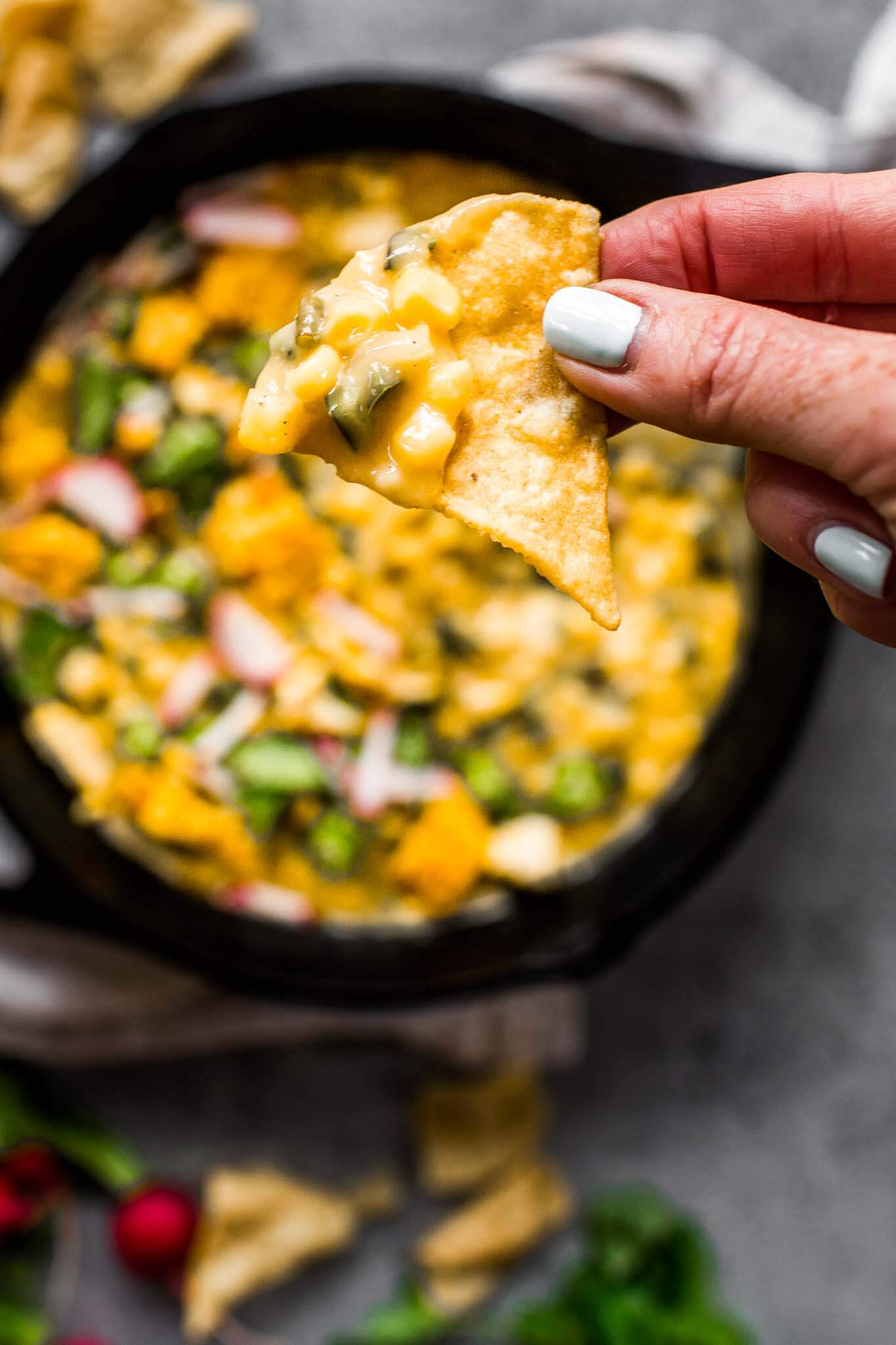 Hand dipping chip into corn queso dip