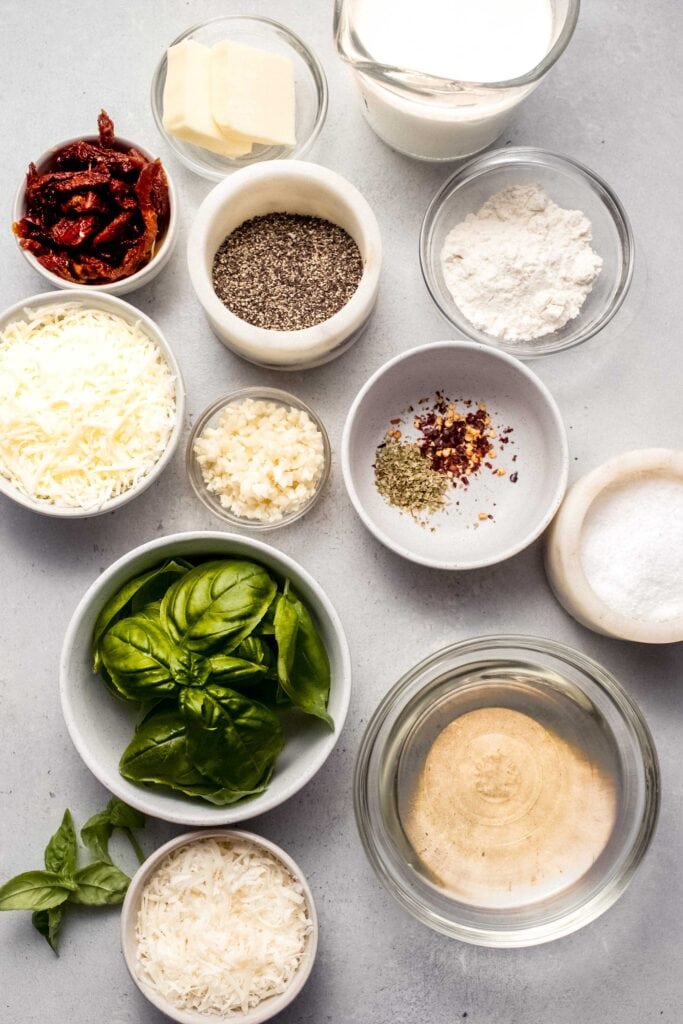 Just like my Broccoli Pesto Pasta and Tuscan Creamy Gnocchi, this sauce makes the whole meal. It’s a luxurious cream sauce decked out with melted mozzarella and parmesan cheese, and has pops of color and flavor from sun dried tomatoes.