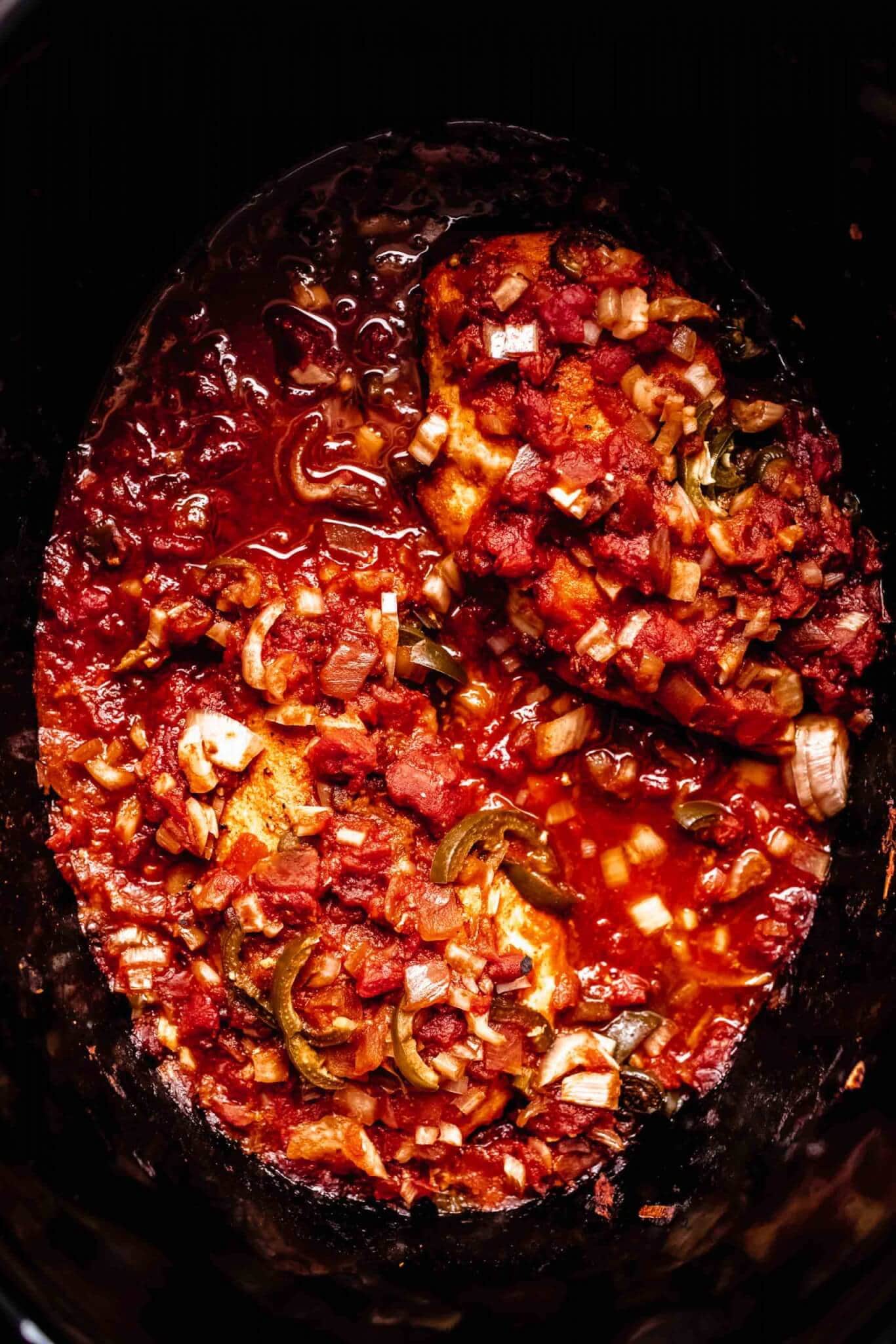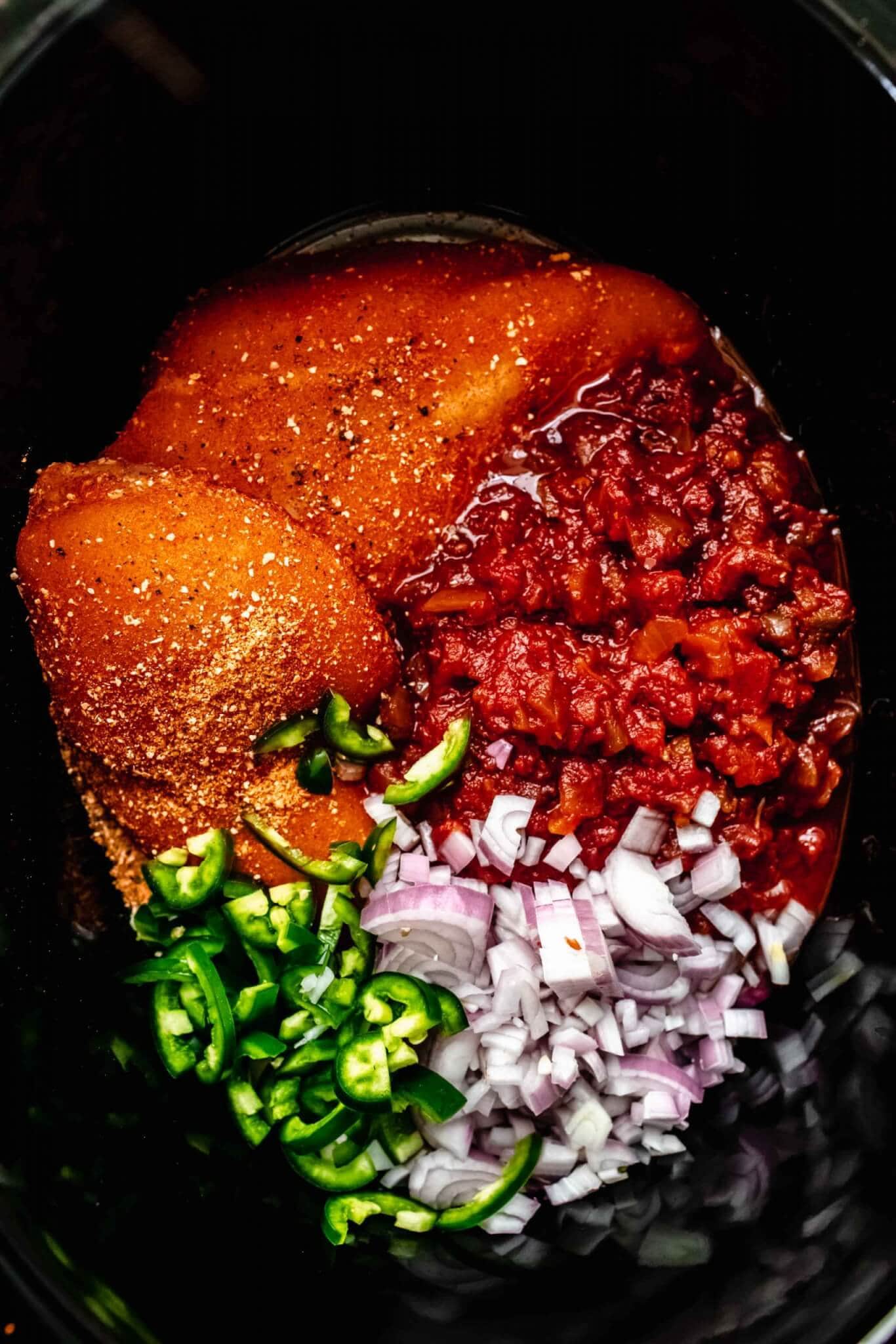 - Spread chopped onion and jalapeno over chicken breasts. Pour salsa over top.