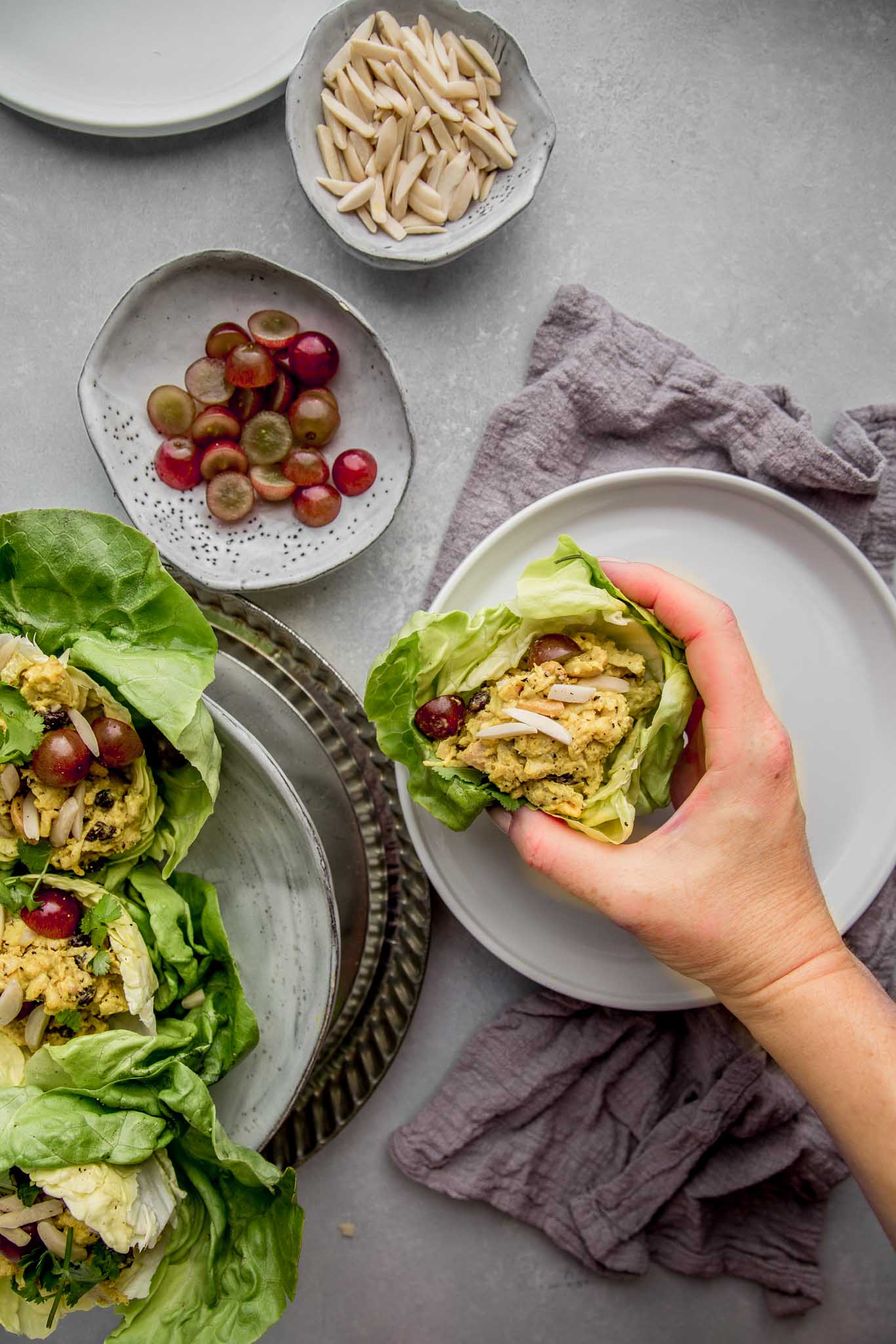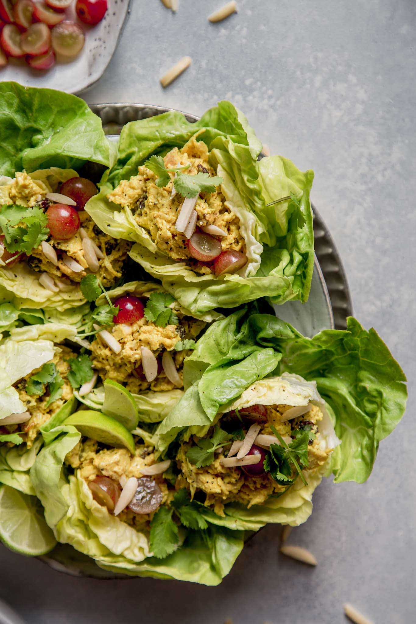 - Scoop the curry chicken salad into lettuce cups and top with grapes and slivered almonds.
