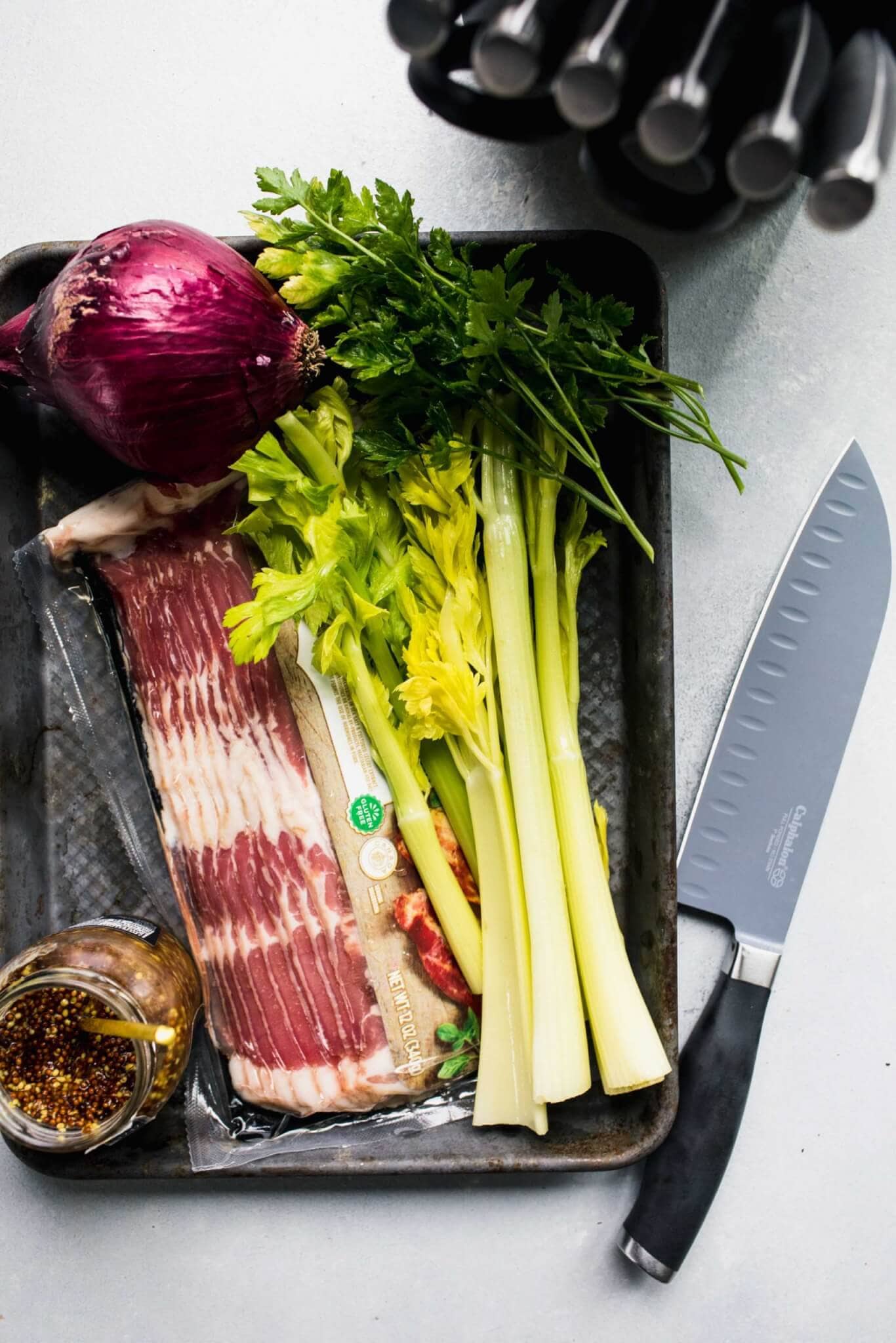 - Add the onion to the bacon fat. Season with a pinch of salt and cook for about 3-4 minutes, until softened.