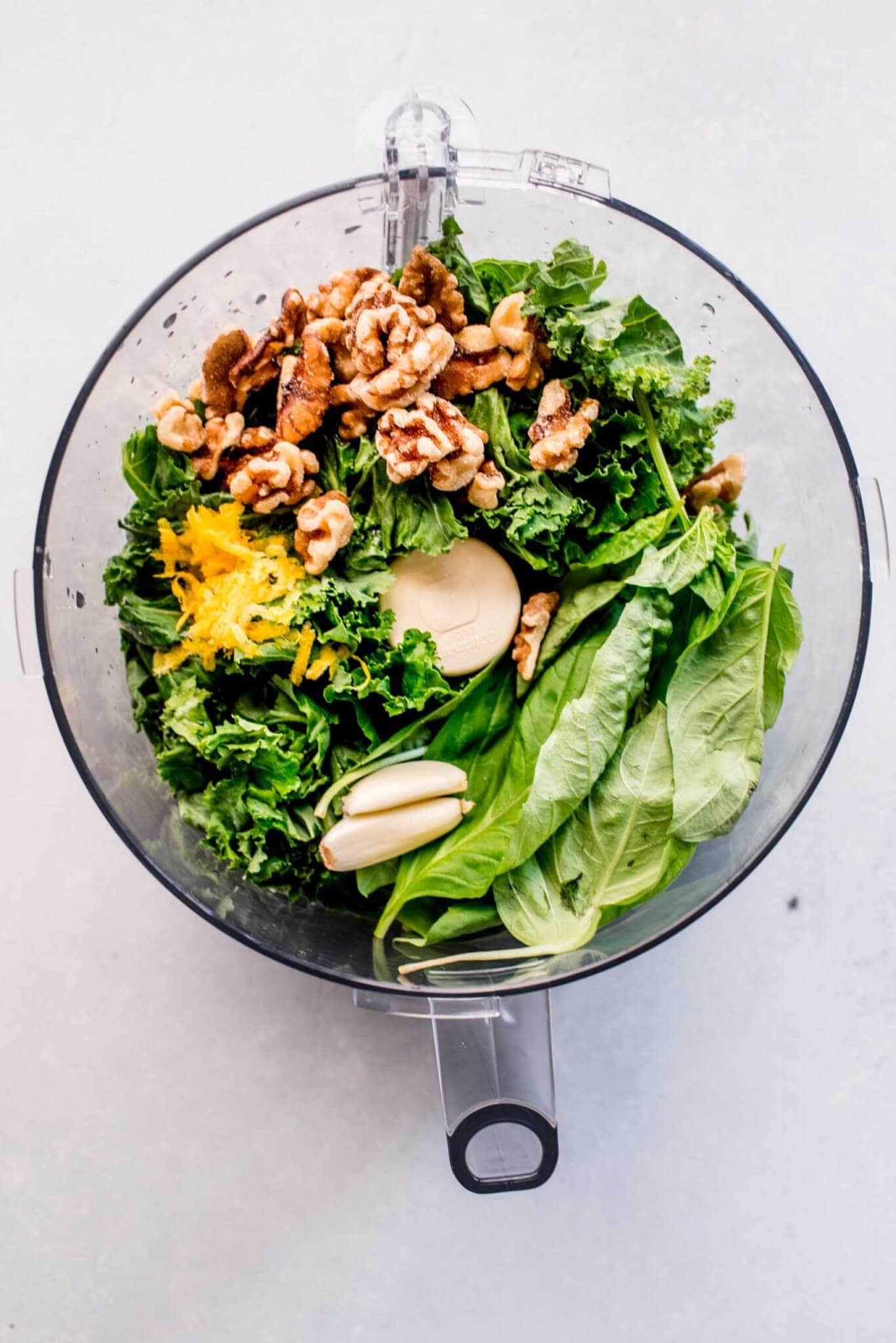 2. Make the Pesto – pulse together kale, basil, olive oil, walnuts, garlic and lemon.