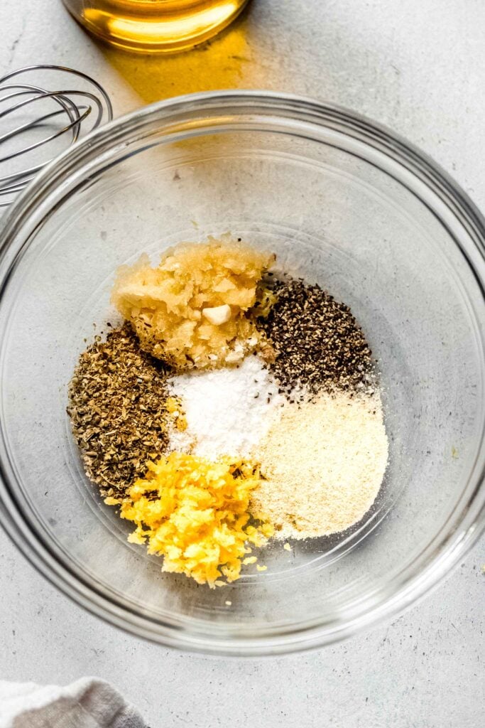 - Start by whisking the marinade ingredients in a medium bowl or glass measuring cup.