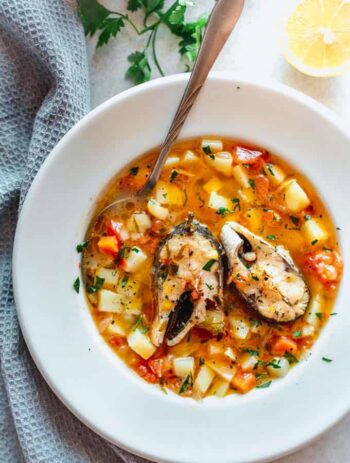 This flavorful & nutritious Greek Fish Soup is made with fresh Grey Mullet or Sea Bass. + potatoes, carrots, celery, tomato, and lemon. Truly appetizing!Get the RECIPE from Real Greek Recipes
