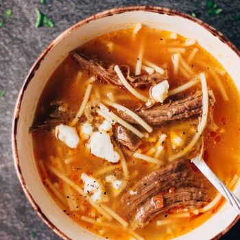 The Greek version of Asian noodle soup! Using the meats stock along with fresh tomatoes, spaghetti, and some crumbled feta to serve with. This soup is simplicity at its finest.Get the RECIPE from Real Greek Recipes