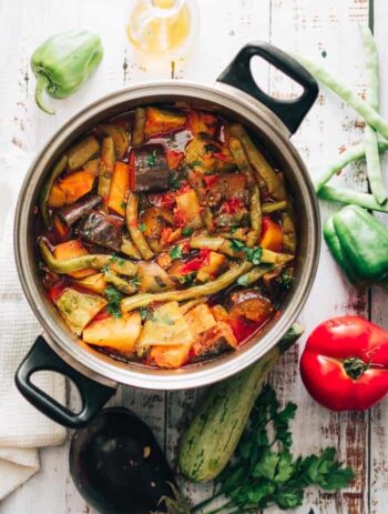 A hearty Greek Vegetable Stew. Eggplants, zucchinis, pepers, potatoes, green beans, all cooked in a rich & flavorful tomato sauce.Get the RECIPE from Real Greek Recipes