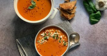 This Greek tomato soup with feta and basil has traditional flavors with a mediterranean feel and smells like summer.Get the RECIPE from The Greek Foodie