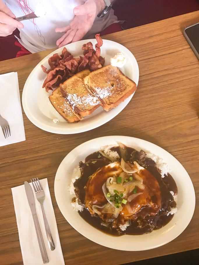 On Day 3, I woke up with Loco Moco on the brain. If you haven’t heard of Loco Moco, you’ve probably never been to Hawaii. It’s a traditional Hawaiian dish which consists of a hamburger patty, served over a bed of rice with brown gravy and an egg on top. So good! The Hawaiian Style Café in Waimea came highly recommended to us. I’d heard that the portions were huge, especially the pancakes, but I was ready. This girl can eat. I went with the aforementioned Loco Moco, with their housemade hamburger patty. Note: They serve two types of Loco Moco – And our waitress gave me the scoop. The one listed in the menu uses frozen burger patties, but the one on the specials board is their own housemade patty – That’s the way to go. It also comes served with sautéed onions on top. Rick ordered the Macadamia Nut French toast which you can probably image was out of this world as well.