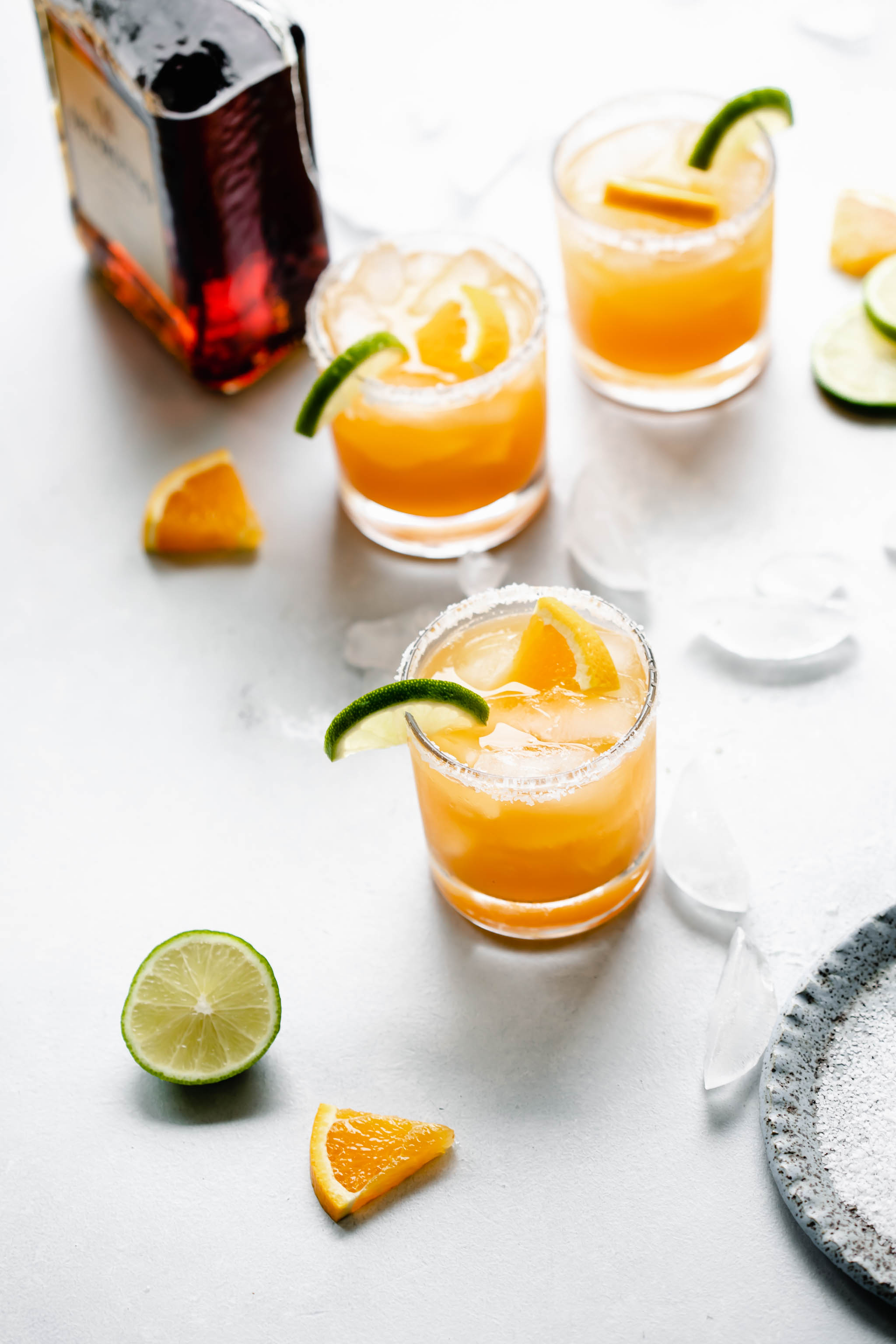 • Strain into a salt or sugar rimmed glass full of ice. Garnish with fresh orange and lime wedges.
