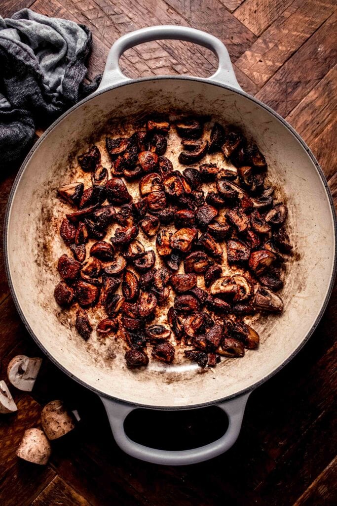 - After cleaning the mushrooms, dry them really well with paper towels. Dry mushrooms have a better chance of crisping when pan-fried, which prevents them from becoming soggy in the sauce.