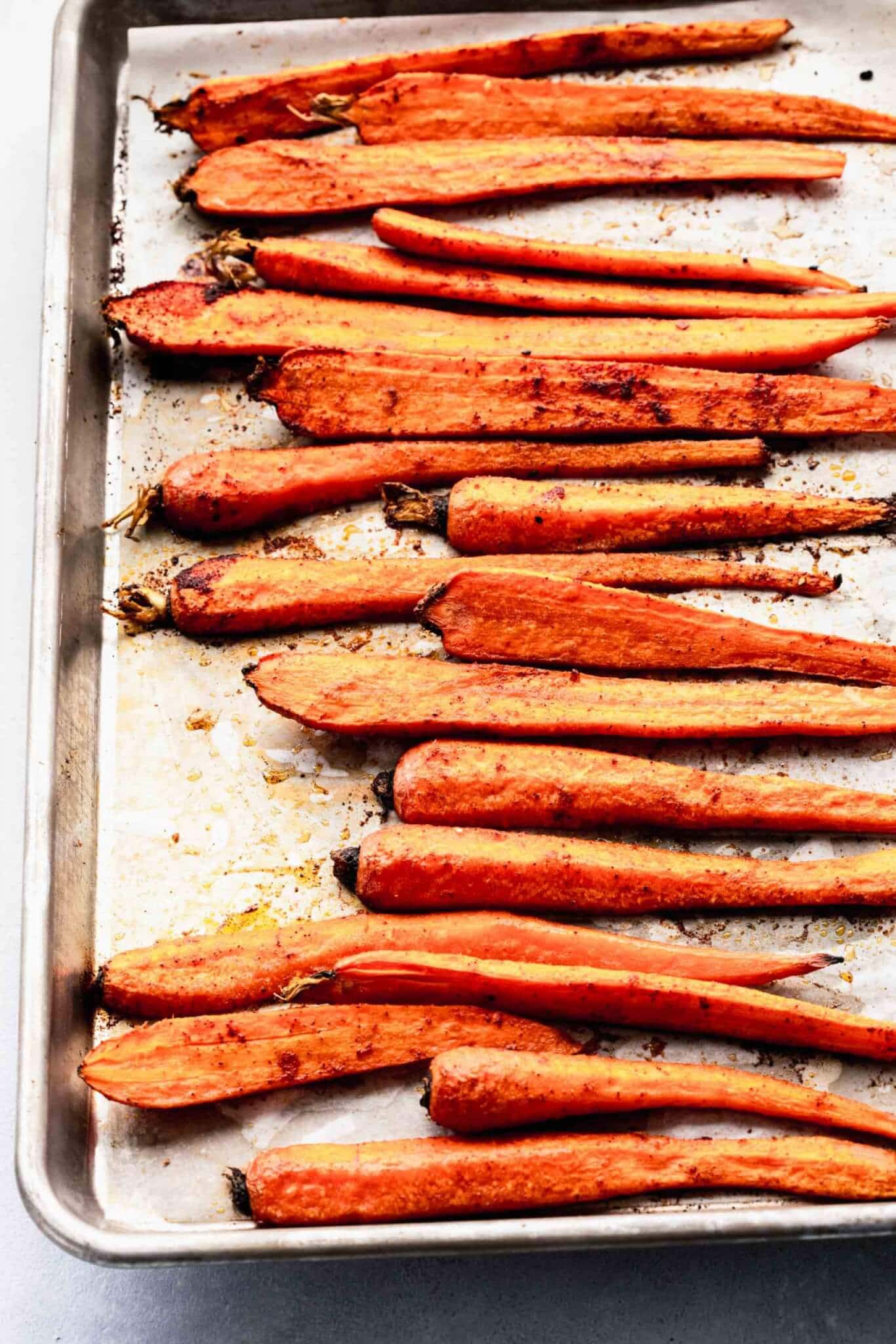 - Arrange the carrots on a baking sheet and drizzle with olive oil, toss with chili powder and cumin, and season with salt & pepper.