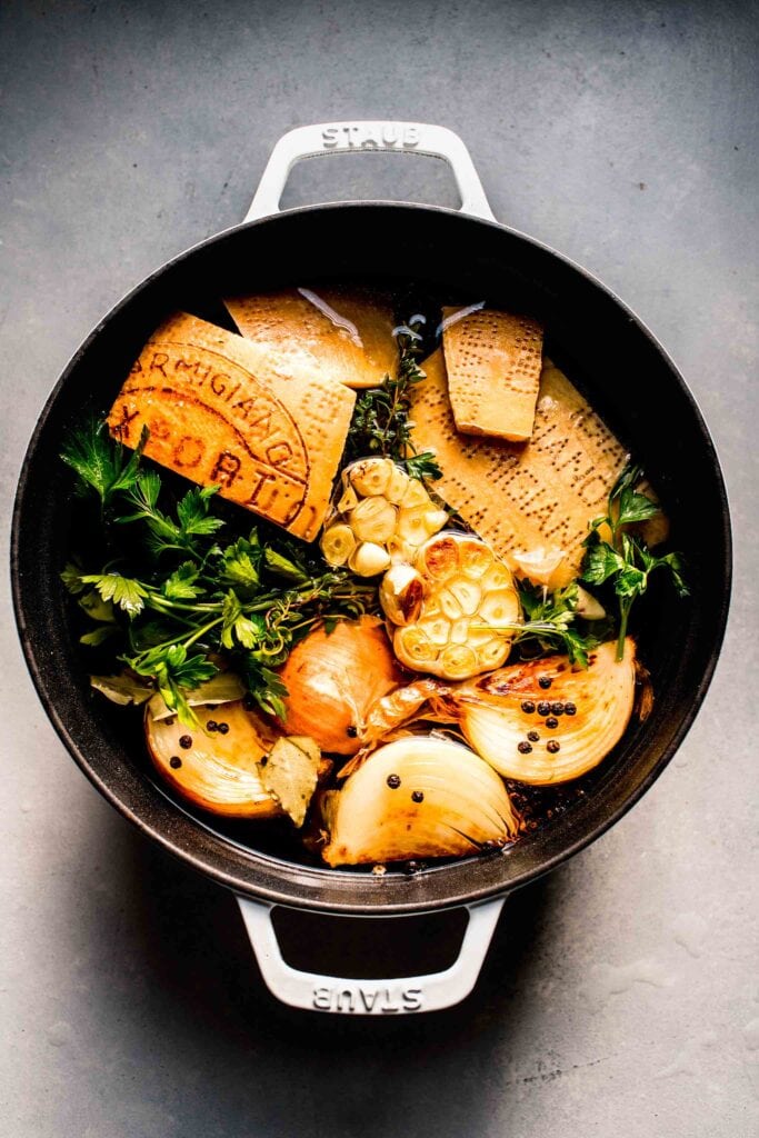 - Parmesan Rinds – You’ll need about 5 large parmigiano reggiano rinds for this recipe. Don’t have any on hand? Many grocery store cheese counters carry parmesan rinds.