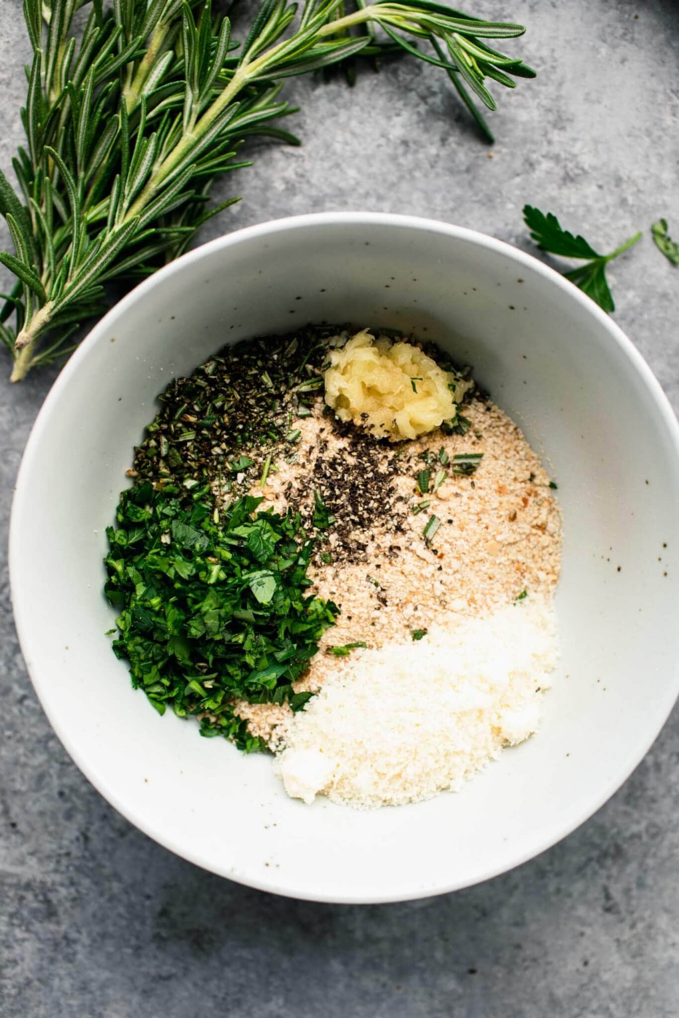 Breadcrumbs, herbs and parmesan cheese in small white bowl.