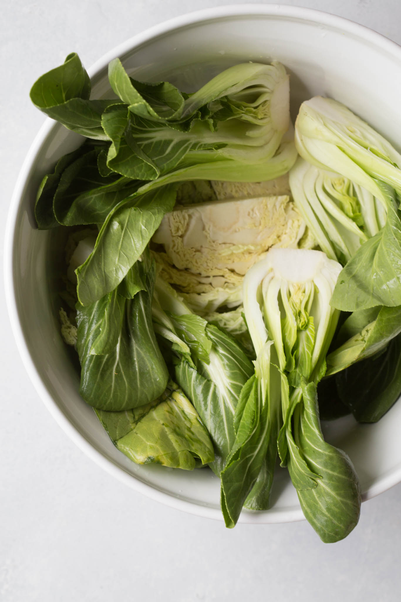 - Place bok choy, cabbage, and mushrooms in a large bowl. Drizzle with oil and add half of ginger and garlic. Toss to coat; season with salt and pepper.