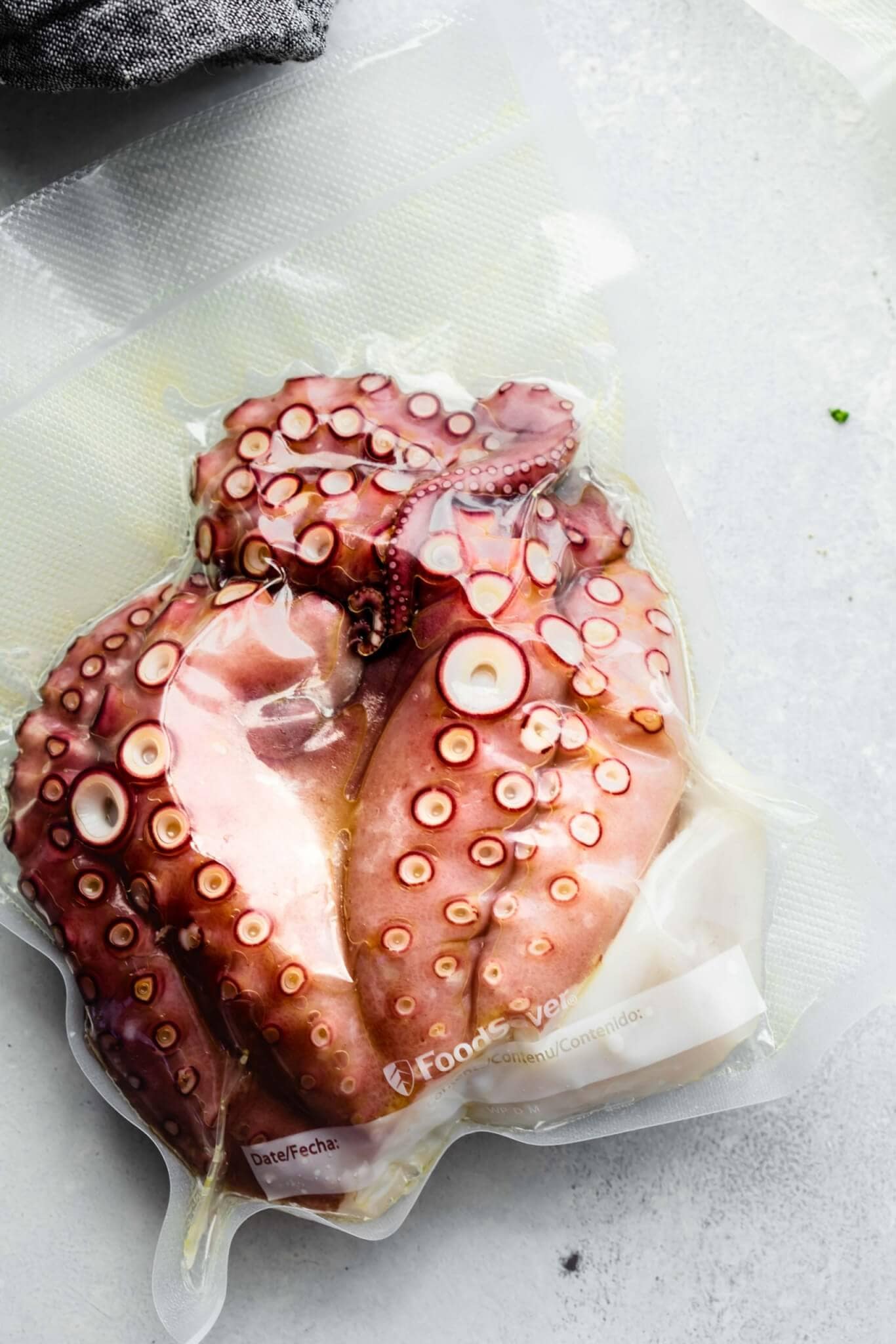 - Once cool, add the octopus, olive oil and a pinch of salt to a FoodSaver bag and seal using vacuum sealer. Alternatively, you can use the water displacement method, however, I would recommend double bagging the octopus. If the octopus is very large, you may want to cut it into two or more portions.