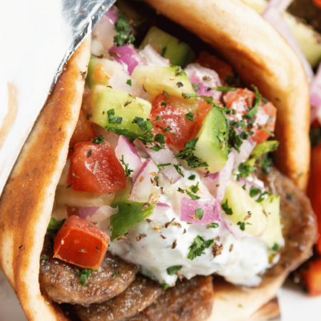 Wondering what to serve with gyros for dinner? This handy guide covers all of the best sides – from veggies, to salads, and more! Try this Tomato Cucumber Salad. Dressed in a tangy homemade red wine vinaigrette, every bite is bursting with refreshing Mediterranean flavors!
